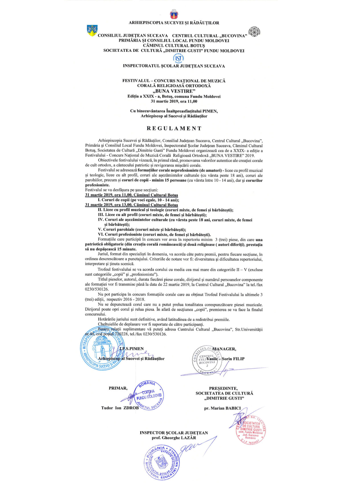 ARHIEPISCOPIA SUCEVEI ŞI RĂDĂUŢILOR CONSILIUL JUDEŢEAN SUCEAVA CENTRUL CULTURAL ”BUCOVINA” CENTRUL PENTRU CONSERVAREA ȘI PROMOVAREACULTURII TRADIȚIONALE CĂMINUL CULTURAL BOTUȘ SOCIETATEA DE CULTURĂ ”DIMITRIE GUSTI” FUNDU MOLDOVEI INSPECTORATUL ŞCOLAR JUDEŢEAN SUCEAVA FESTIVALUL – CONCURS NAŢIONAL DE MUZICĂ CORALĂ RELIGIOASA ORTODOXĂ